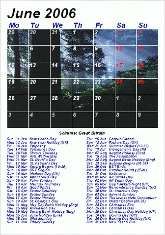 The "1 Month + Events + View" report the calendar for the current month with your chosen events and image from nature.