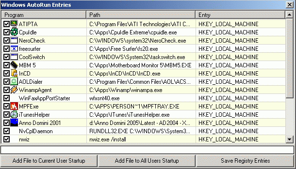 The Autorun Editor allows you to control all programs which automatically start up when you boot your machine. You can either temporarily or permanently disable programs from running on startup or add your own choice of programs to run automatically when you boot into Windows either via the Startup folder or in the Windows registry.