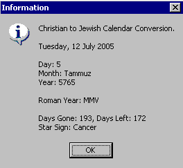 From the main Calendar date, double clicking the mouse on any calendar date will display a new dialog showing the Jewish date equivalent, the Roman year displayed in Roman Numerals and other statistics such as Days Gone, Days Left and the Astrological Star Sign for the chosen date.