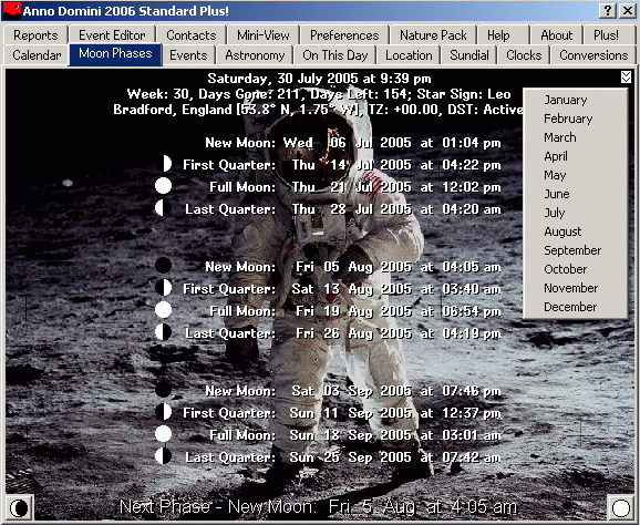 In the Moon Phases tab, the top right-hand corner now displays two arrows on a white background which when clicked on with the mouse displays a drop-down menu of all the calendar months which allows users to select the starting month of the Moon Phases which are displayed in the tab.