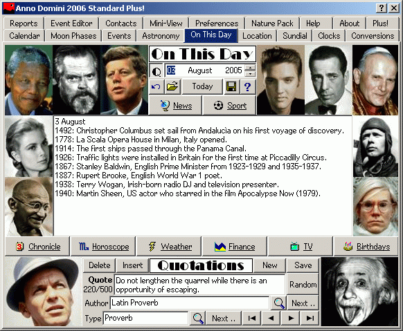 The On This Day tab has been completely re-designed in terms of look and feel with a larger content area. Each of the Internet links has been revised to access News/Weather/Sport services from the Internet which are automatically updated from the Anno Domini web-site. The Chronicle button now accesses the BBC based On This Day library and the Birthdays button now displays birthdays of famous people from the Biography channel.