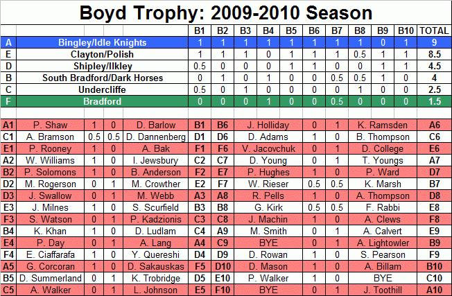 - 14th March 2010 at Valley Parade, Bradford FC, 1pm Start PLAYERS REQUIRED. PLEASE CONTACT THE APPROPRIATE CO-ORDINATOR. The zonal round run by the NCCU will be based on a new format of a Jamboree. Yorkshire intend to provide 7 teams. Open (16 players) and 12 players in the following U180, U160, U140 (2 teams), U120 & U100 based on new ECF grades. Ihor Lewyk is co-ordinating the Open, U180, U160 teams Tel. 01274 567559, ihor13@tiscali.co.uk John Fozard is co-ordinating the U140, U120 & U100 teams, Tel. 01226 792948, johnfozard@btconnect.com It has been decided that the county will put out 3 teams in the U140, U120 & U100 based on a junior/adult mix that will give up and coming youngsters a feel of the competition and a chance of long play (1pm - 5pm ... time control proposed 40 moves 1hr 45 + 15 mins) at this level in a large team. We are aiming for a 50/50 split if possible of junior/adults. If any junior or senior player is definitely available and is keen to be considered for selection please get in touch with John Fozard in the first instance. Stephen Burton is captain of a second U140 team based around the players that played in the U125 team (old grade) last year and will be made up of senior players, Tel. 0113 256 8157, sburtonchess@aol.com If the teams qualifies for the next stage - players must be prepared to travel for the national play-offs later in the year between April and July (dates yet to be announced). John Fozard Chess.com Update: The newly formed online Bradford chess team has now established itself with a core of players including Winston Williams, Matty Webb, Robert Pells; Peter, Graham & Nigel Redmond; John Holliday, Keith Marsh & Daz Bedford alongside other non league players including ex Allerton player Chris Wray & former St Bede's player Andy Krzyszczyk. A number of games have commenced including matches against Bristol & Northampton with others in the pipeline against Tashkent, The Channel Islands, Glasgow, Hong Kong & Singapore - all at a rate of 3 days / move. New members of any grade are more than welcome to strengthen the squad; you can join us for free on www.chess.com and searching the groups for 'Bradford'. John Holliday (Dark Horses). BDCA League Positions