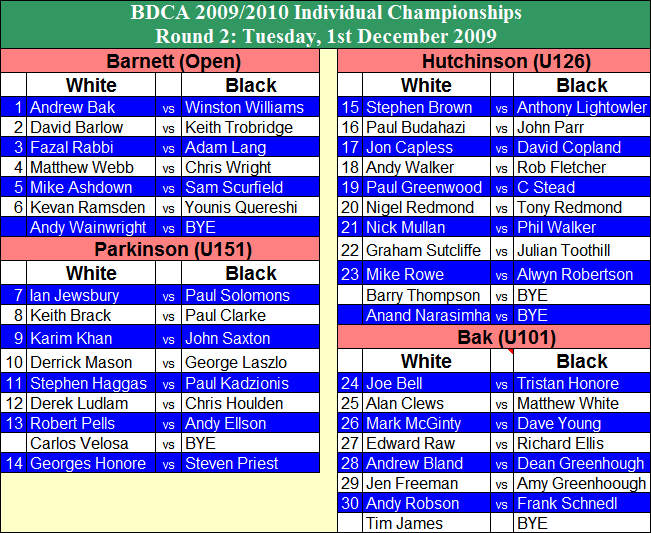 - Round 4 Draw BDCA Individual Competitions - Round 3 Results: Barnett (Open): Lang 0.5 Barlow, Bak 0.5 Webb, Rabbi 0-1 Williams, Trobridge 0-1 Ashdown, Wright 1-0 Wainwright. Parkinson (U151): Solomons 0.5 Clarke, Laszlo-Khan (rescheduled), Saxton 0-1 Madden, G.Honore 0-1 Jewsbury, Ludlam 0-1 Brack, Haggas 1-0 Mason, Houlden 1-0 (default) Ellson, Pells- bye, Kadzionis-bye. Hutchinson (U126): Capless 0-1 Brown, Fletcher 1-0 Stead, A.Walker 1-0 Budahazi, P.Walker 1-0 Rowe, Yakovchuk 1-0 N.Redmond, Lightowler 0.5 Copland, Parr 0-1 Greenwood, Thompson 1-0 T.Redmond, Mullan 0-5 Toothill. Bak (U101): McGinty 1-0 Bell, Schnedl 0-1 Clews, White 0-1 Bland, Robson 1-0 Raw, Ellis 1-0 T.Honore, Young 0-1 Freeman, A.Greenhough 0-1 D.Greenhough. BDCA Individual Swiss
