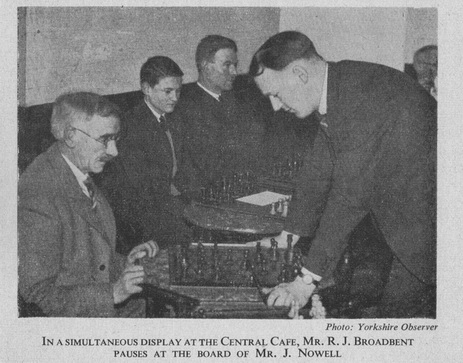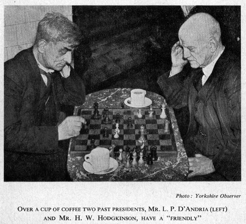 The club has also distinguished itself in correspondence chess. For the last three years it has competed in Division I of the Postal Chess League, which embraces the whole country, and each time it has been champion. Since the institution of the Yorkshire Junior Championship in 1936-7 two of its members have been victorious—A. C. Jowett in 1948, and P. C. Gibbs in 1951 and 1952—but, strangely enough, considering the large number of strong players it has had since chess championships were first mooted in the county, it has done surprisingly little of note in the Yorkshire Individual Championship.