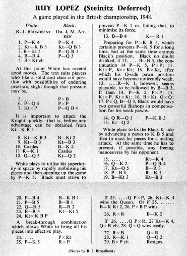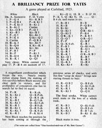 Possibly the desire for master play was well satisfied about that period by other attractions, for the Bradford club had the honour of providing accommodation, officials and chessmen for two very important matches. One was the play-off for the British championship between F. D. Yates, who eventually became a member of the club, and H. E. Atkins, whose names will always be outstanding in the history of British chess and both of whom are so well remembered by the older members. Yates, who was born at Birstall on 16th January, 1884, and who first gained attention in Leeds chess circles, was six times chess champion of Great Britain. Henry Ernest Atkins, who was born at Leicester on 20th August, 1872, was nine times British champion. He came to Huddersfield in 1909 as principal of the College Secondary School, a position from which he retired in 1936, was a member of the Huddersfield Chess Club and, like Yates, who was a member of the Leeds club, played in many Woodhouse Cup matches. In 1911 the British championship tournament, which was first played in 1904 (in Hastings) and which had succeeded the amateur championship (1886-1902), was played in Glasgow. Atkins had tied with W. E. Napier in 1904 but had been defeated in the play-off. He was champion, however, in 1905-6-7-8-9-10, while Yates had been equal fourth with J. H. Blackburne in 1909 and equal second with the same player in 1910. Therefore in 1911 when Atkins & Yates tied for the championship with 8.5 points out of a possible 11 the play-off in Bradford in January, 1912, aroused great interest. But it was an easy victory for Atkins. He won all three games. The other. important match in Bradford that season was between Yates and the Rev. W. C. Palmer who has been described as one of chess's "fighting parsons", and who had distinguished himself in British chess before leaving to take up a living in Trinidad. He came home on holiday to take part in the 1911 championship tournament, and at the Central Cafe that year played Yates a match of three games. Yates won them all. Yates became a member of the Bradford club on 2nd November, 1916, at which time he was employed in an office in the city. He had won the British championship in 1913, had tied with Blackburne in 1914, but was awarded the title when Blackburne, who was in poor health, preferred to resign than to play a deciding match. A month before he joined the club another distinguished player—A. G. Conde, a Mexican who had lived for a long time in England, had become a member. They both became familiar figures at the club meetings and in the lunchtime games at the cafe. A few days after Conde had joined and before Yates had actually become a member it was decided that Mr. I. M. Brown, who had played so large a part in.the success of the Bradford club and of British chess, should ask the two to play a series of five games on Saturdays or club evenings. Yates and Conde readily agreed. It was a notable encounter, and in "A Century of British Chess" is described by the author, Philip W. Sergeant, as the principal over-the-board event in Britain in 1916. The result was a tie, but in subsequent club contests which are referred to in the minutes Conde had slightly the upper hand. Today competitors for the club's Priestman Trophy will be delighted to know that in 1918-19 it was fought for by these two master players and eleven others in a tournament which, says the annual report of that season, "probably was the most satisfactory and interesting one for many years". Conde won the trophy and the first prize, valued at 21 s., with 112 points. Yates was second (prize value, 15s.) with 102, and J. W. Morton third (prize value, 8s.) with 7. In the same season there was what is described as "the annual 'Good Companion' problem solving competition". There were eight competitors for three book prizes, the first of which was won by I. M. Brown, who solved eleven problems in 51 minutes, the second by Conde who solved nine in 1 hour 5 minutes, and the third by Yates who solved nine in 1 hour 9 minutes. To the younger members of the Bradford Chess Club who may have heard little of Yates, without doubt the most distinguished player in the club's membership record (apart, of course, from those two famous honorary members, Capablanca and Marshall) I would suggest that they obtain a copy of his book "One-hundred-and-one of My Best Games of Chess", a work arranged and completed by W. Winter after Yates' tragic death. It is a joy to play all of them, particularly the one in which he defeated the great Dr. S. Tarrasch at Hamburg in 1910. After the great days of the nineteenth century when, says Winter, 'Britain's professional masters had been little, if any, behind their Continental rivals, there came a change. "The great masters were either dead or past their best, and the growing tendency among amateurs and patrons of the game to devote their energies to club and league competitions, offered no inducement to any young player to take up the game professionally. As a result the appearance of British players in the international arena became fewer and fewer, and with the notable exception of Atkins' one appearance at Hanover, distinctly unsuccessful. Internationally speaking, British chess seemed doomed to extinction, when in 1910, on the strength of two first prizes in small native tournaments, Yates received an invitation to take part in the International Masters Tournament at Hamburg. Although as was to be expected in such company, his score was a poor one, he showed promise of what was to come by defeating Tarrasch, then at the height of his fame by a brilliant sacrificial combination." The game was described as a credit to British chess and, says Winter, it gave particular satisfaction at the time, as Dr. Tarrasch had adversely criticised the inclusion of the youthful Yates in the tournament. Yates travelled far. He played brilliantly, and had two fine wins and four draws against Alekhine, for one of wh