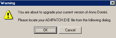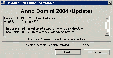 If you are running a version of Anno Domini 2003 prior to v1.15 (Build 1) 1st December 2003 and wish to upgrade to Anno Domini 2004, please click here to update to AD 2003 v1.15, Build 1 of Anno Domini 2003. Once v1.15 is installed, you may use the following update to install Anno Domini 2004.