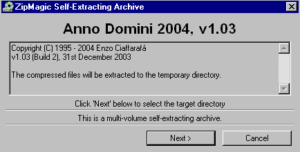 The complete shareware version of Anno Domini 2004 can be downloaded as one 2.73 MB file or as two floppy disk images. You must agree and abide to the Anno Domini 2004 terms and conditions in the Distribution and End User Agreement below before proceeding with installation. Full installation instructions are detailed below. Please print this web page for reference.