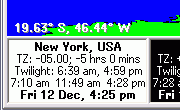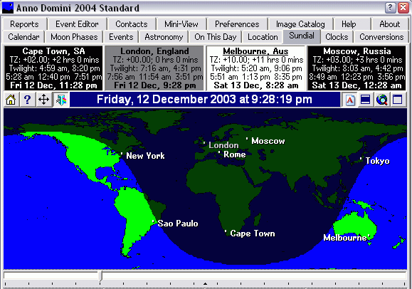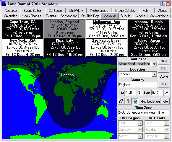 A globe icon has been added to the Location tab which allows you to toggle between viewing the existing map of world time zones or the position of the currently chosen home location on the world map with the current sundial view. When any location from the Anno Domini database is chosen, you will see that location highlighted on the map as below for London, United Kingdom.