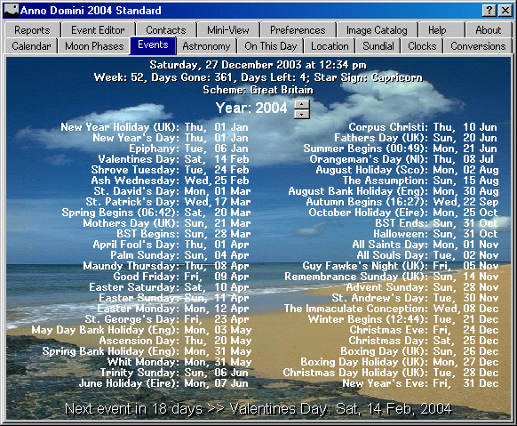 The Events tab displays the major national holidays and events for England, Wales, Scotland, Northern Ireland, Republic of Ireland, United States of America, Canada, Australia, New Zealand and Europe for any given year until the year 2150 whilst also highlighting the bank holidays and the next event which will occur in relation to the current date. Also, all of the major Christian festivals including the moveable events such as Easter Sunday and Advent Sunday for any given year from 1753 to 2150 are also calculated and displayed for the selected calendar year. The background image can be changed to an image of your choosing: