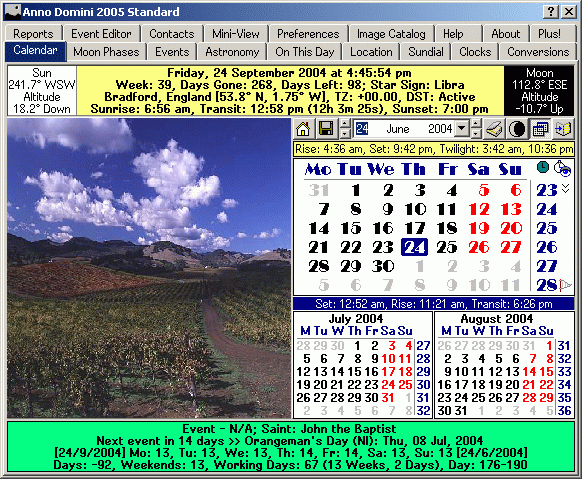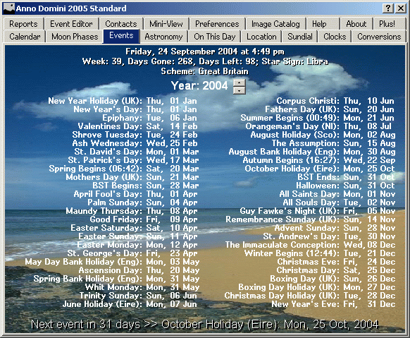 The Events tab displays the major national holidays and events for England, Wales, Scotland, Northern Ireland, Republic of Ireland, United States of America, Canada, Australia, New Zealand and Europe for any given year until the year 2150 whilst also highlighting the bank holidays and the next event which will occur in relation to the current date. Also, all of the major Christian festivals including the moveable events such as Easter Sunday and Advent Sunday for any given year from 1753 to 2150 are also calculated and displayed for the selected calendar year. The background image can be changed to an image of your choosing: