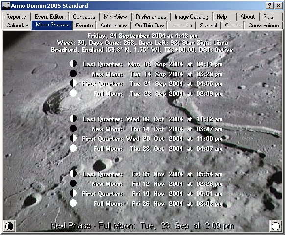 The Moon Phases tab will display for the currently selected month and the subsequent two months, the dates and times of all moon phases. The background image of the Moon can also be changed to an image of your choosing:
