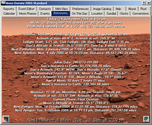 Anno Domini is an astronomical calendar/almanac program which is designed to accompany the many personal information managers (PIMs) on the market and has the following major features: