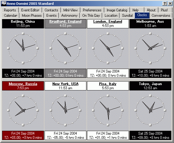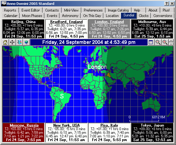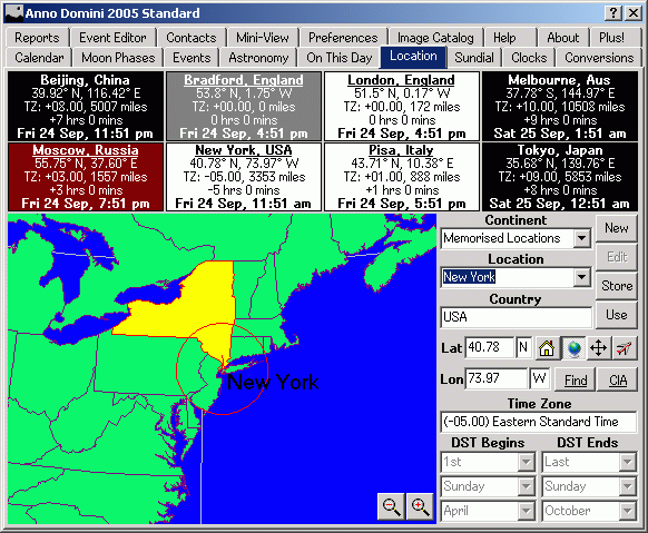 The Location tab allows you to select your city and country specific details such as latitude, longitude and time zone on Earth from a database of over 500 cities (divided by continent) from around the world. You can also add your own user-defined locations with full editing facilities. A colourful display of the world is shown to help you determine your time zone. Anno Domini has a database of rules to determine Daylight Saving Time for all locations around the world which can be amended if necessary. Apart from your own location, Anno Domini can also store 7 other locations from around the world where you can view the times in those locations in real time (taking fully into account any adherence to Daylight Saving Time) along with useful information such as latitude, longitude, time zone, distance and the sunrise, transit and sunset times for that location.