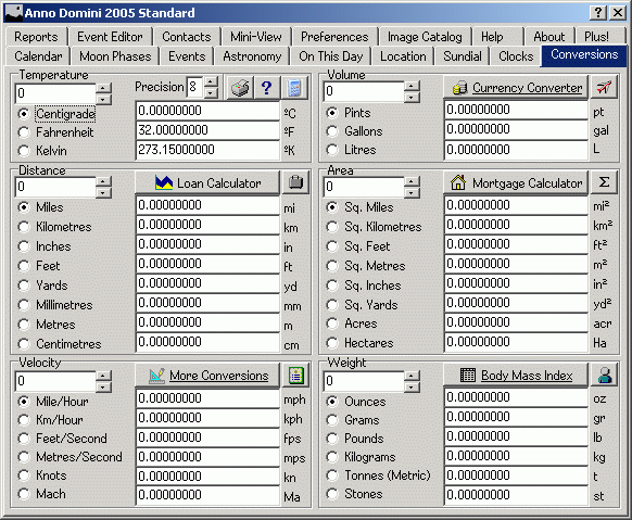 The Conversions tab allows you to quickly and easily convert between imperial and metric units for many measurements such as temperature, volume, distance, area, velocity and weight. Any of the results can be copied and pasted into other documents or manipulated via the Calculator function provided: