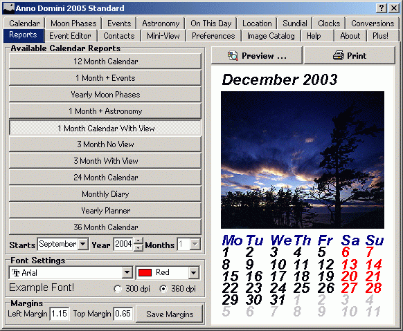 The Reports tab allows you to send to the printer various reports such as a yearly calendar, the dates and times of all moon phases for your location for the selected year, a full list of all events occurring in that year from your database and a bi-monthly report of the times of sunrise, moonrise, transit, sunset and moonset for your chosen location on Earth. Other reports include a 3 month view, your diary entries for a calendar month and a yearly planner. You can also preview how the information will appear on paper via the Preview option;