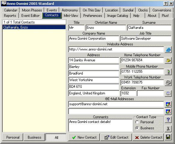 The Contacts tab allows you to create a database of your personal and business contacts including addresses, telephone numbers, e-mail addresses and Internet web sites. For each entry, a single click of a button will either dial the selected number, access the web site or start your default e-mail program with an e-mail addressed to your contact.