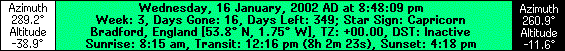 The Astronomy tab shows astronomical data regarding the Sun and the Moon such as their times of rise and set, distances from Earth, compass directions and altitudes. You can also view the times of dawn and dusk and also the angle and fraction of the illuminated limb of the Moon, all update in real time for your chosen location on Earth. The background image can be changed to an image of your choosing: