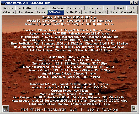 Anno Domini is an astronomical calendar/almanac program which is designed to accompany the many personal information managers (PIMs) on the market and has the following major features: