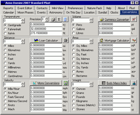 The Conversions tab allows you to quickly and easily convert between imperial and metric units for many measurements such as temperature, volume, distance, area, velocity and weight. Any of the results can be copied and pasted into other documents or manipulated via the Calculator function provided: