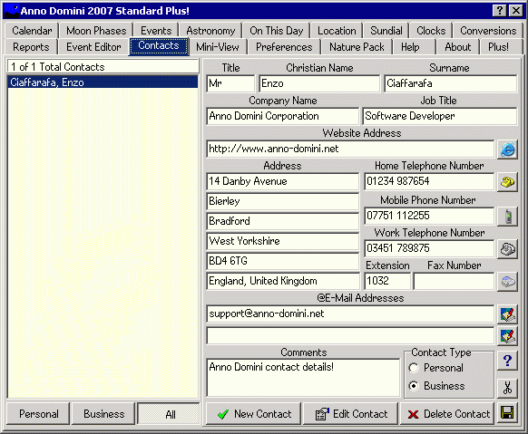 The Contacts tab allows you to create a database of your personal and business contacts including addresses, telephone numbers, e-mail addresses and Internet web sites. For each entry, a single click of a button will either dial the selected number, access the web site or start your default e-mail program with an e-mail addressed to your contact.